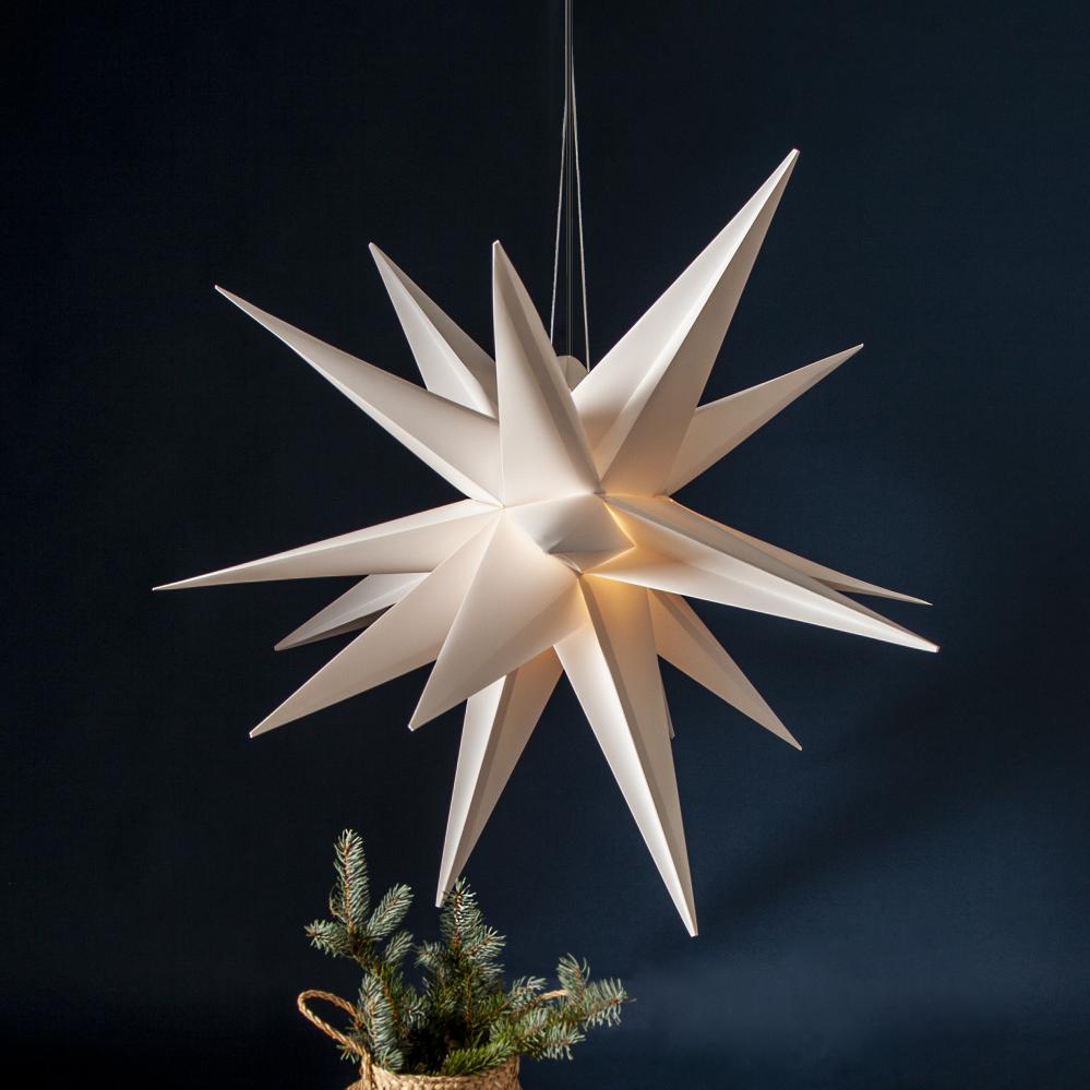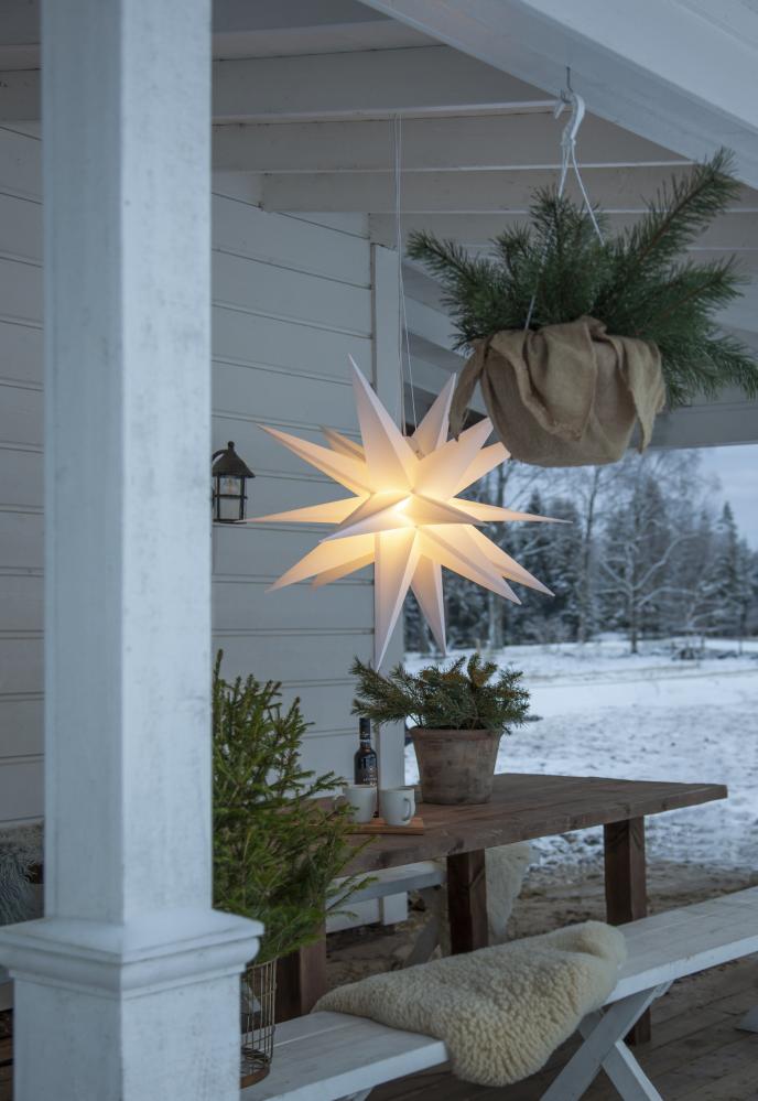 Maffig, 1 meter stor, vit tredimensionell stjärna för utomhusbruk. Lyser med varmvitt sken (LED-lampa ingår). Den inbyggda timern gör det lätt att ställa in när stjärnan skall lysa. Lyser upp trädgården eller varför inte hänga den över matbordet inomhus. Den sprider en härlig känsla hela vintern.