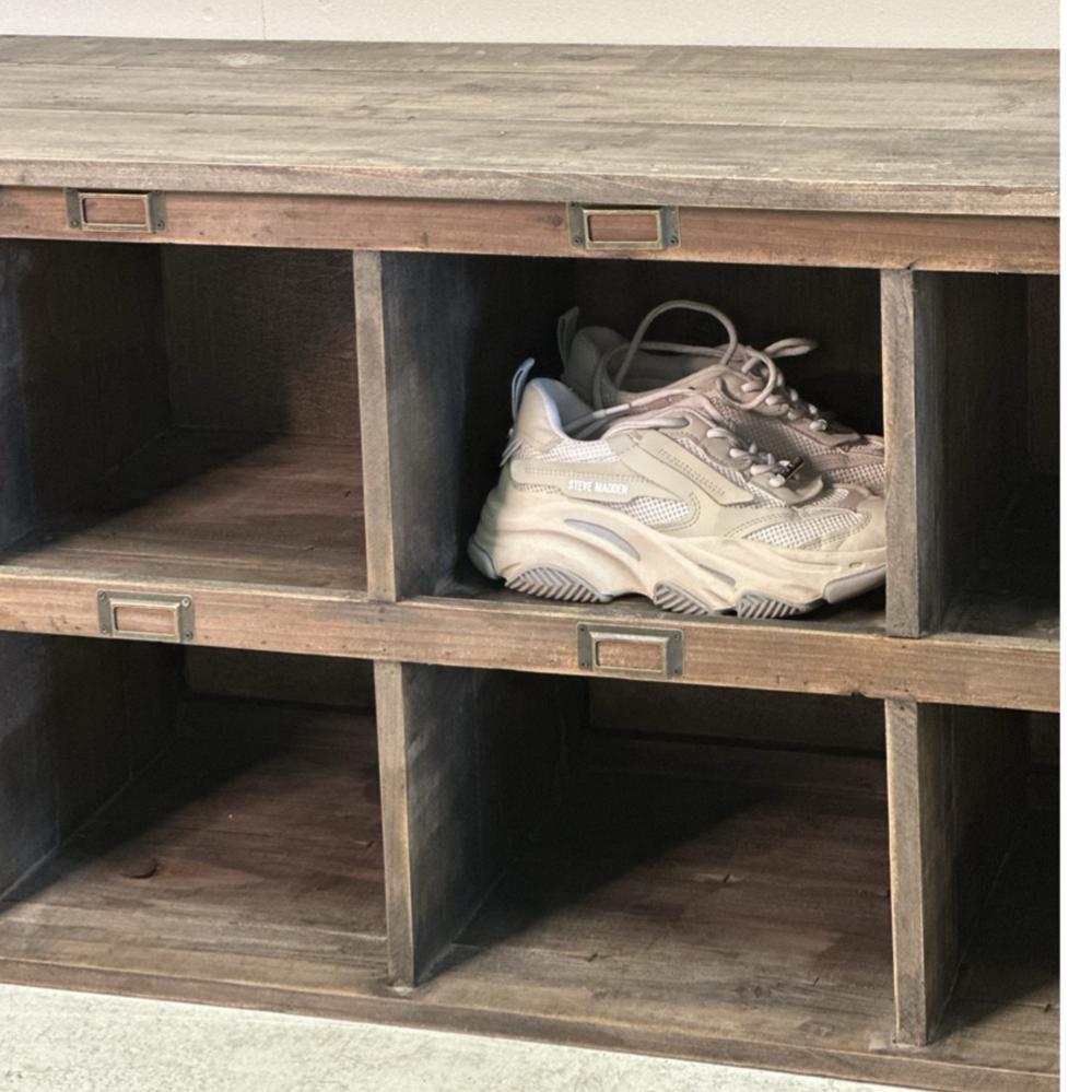 Rustik skohylla/bänk som skapar ordning i hallen.