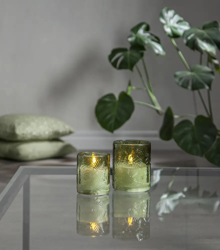Flamme Leaf är en glaslykta med batteriljus gjord av grönt glas med lövmönster i relief runt ett vitt vaxljuset. Ljuset är cirka 8,5 x 10cm. Detta batteriljus blir en vacker dekoration, både ensam och i grupp ihop med övriga ljus från vår Flamme serie. Det har timerfunktion och när brytaren är på timerläget lyser ljuset i ca 30 dagar med en vacker realistisk låga i varmvitt. Det drivs av 2 AA batterier, dessa ingår ej.