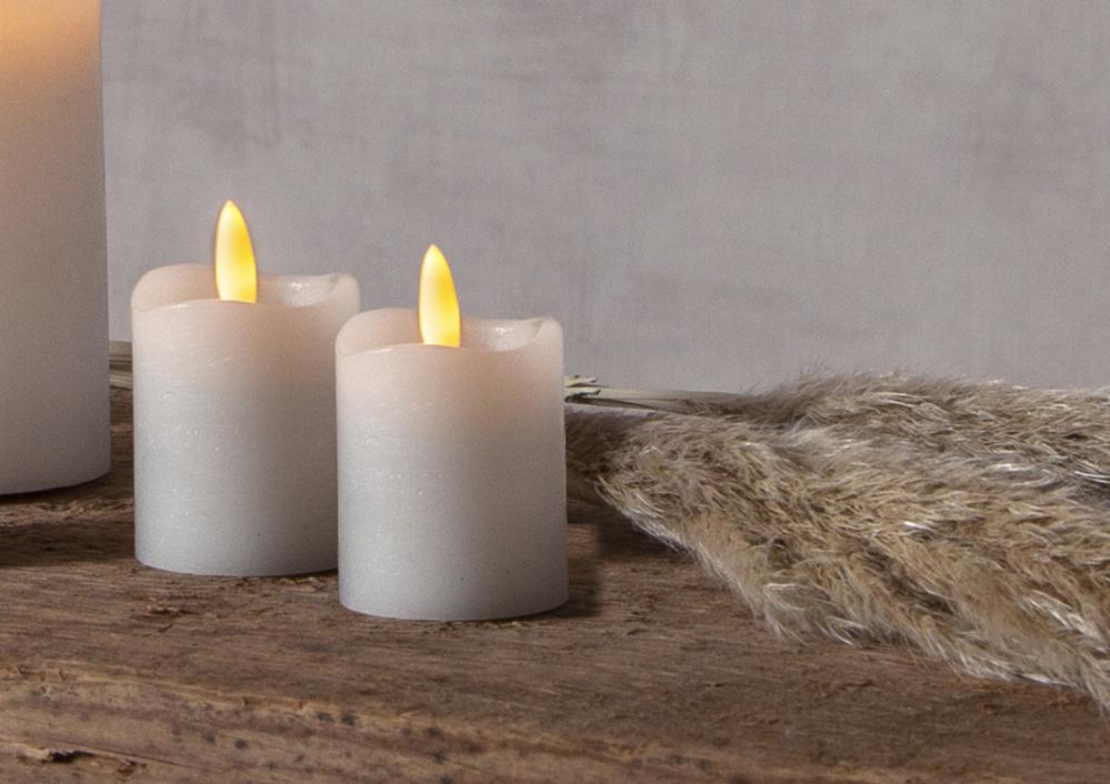 Verklighetstrogna LED-batteriljus i form av 2 vita blockljus i vax. De har ett varmvitt ljussken och en mycket naturtrogen låga och är för inomhusbruk. Du klickar enkelt igång timern på den svarta knappen och då lyser ljuset i 6 timmar och är avstängt i 18h, och sedan repeteras det tills du stänger av ljuset. Fint, stämningsfullt och brandsäkert i ett!