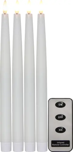 Batteriljusen Flamme Flow är 4 st elektriska kronljus eller antikljus med en naturtrogen 3D-låga. Dessa stearinljus har en blank nedsänkning under lågan som ser ut som flytande vax, vilket gör ljuset änne mer naturtroget. Detta LED-ljus blir en vacker dekoration, både ensam och i grupp ihop med övriga ljus i olika höjder och former från Flamme serien. Fjärrkontroll ingår. Max 5 set (10 ljus) kan styras av samma fjärrkontroll. Avstånd max 5m. Ljusen lyser med en vacker realistisk låga i varmvitt sken. Ljusen drivs av totslt 9st AAA batterier, dessa ingår ej.