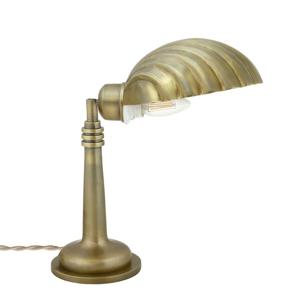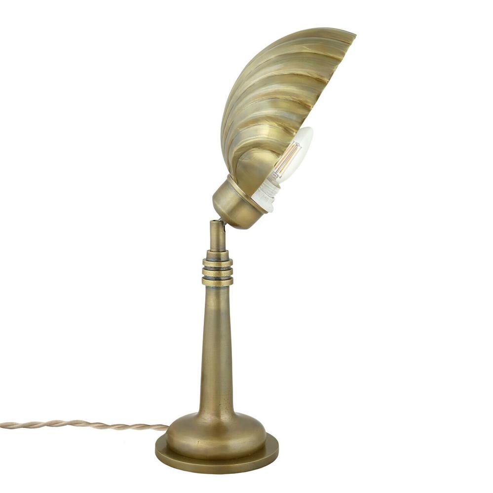 Charmig bordslampa i mässingsfinish med skärm likt en snäcka. Under den dekorativa snäckskärmen döljer sig ljuskällan likt en pärla i en mussla. Skärmen är justerbar åt alla håll som gör att ljuset går att rikta dit man önskar. Passande som sidobelysning eller praktisk skrivbordslampa.