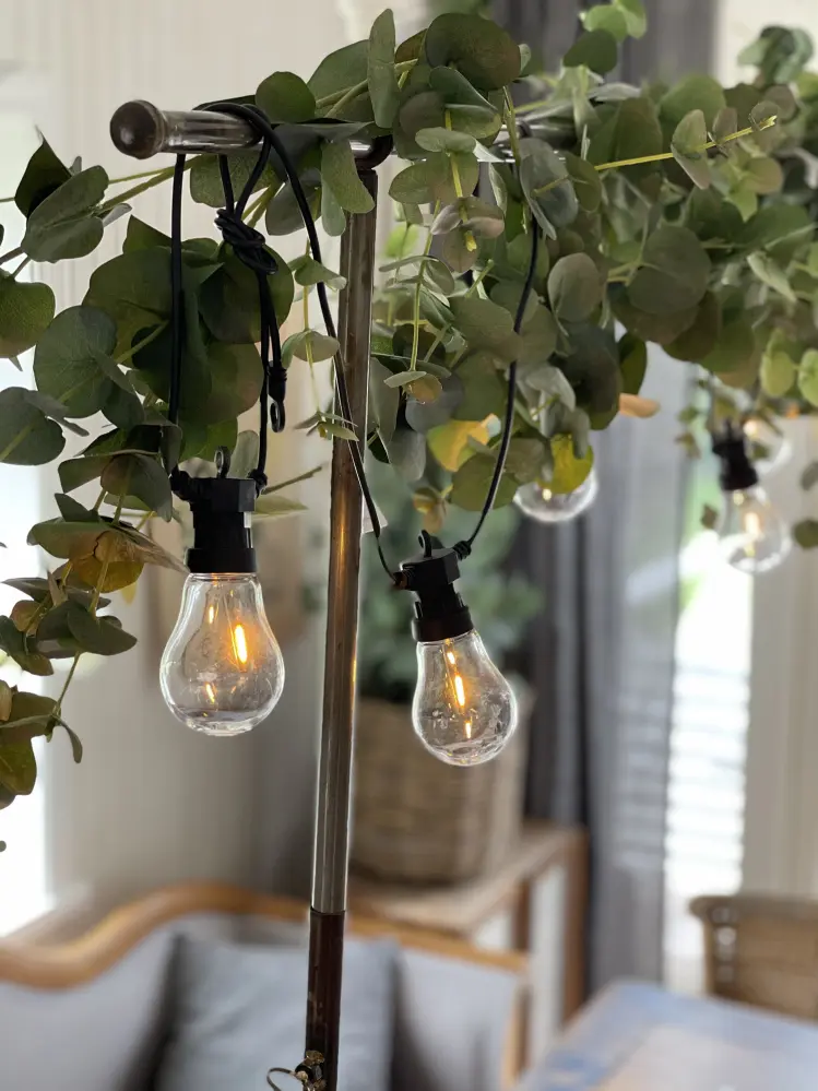 Otroligt fiffig uppfinning som ger en massa valmöjligheter då man vill hänga saker ovanför ett bord. Satte fast den på köksbordet och hängde ljusslingor med stora glödlampor och girlanger av konstgjord eucalyptus som också kommer från Fröken Fräken. Blev superbra och mannen sa "Wow, känns som midsommarafton på Sicilien" :-) Känns som ett ganska bra även från honom. Vi kan behöva lite festlig utlands-sommarkänsla här hemma denna Coronavår.
