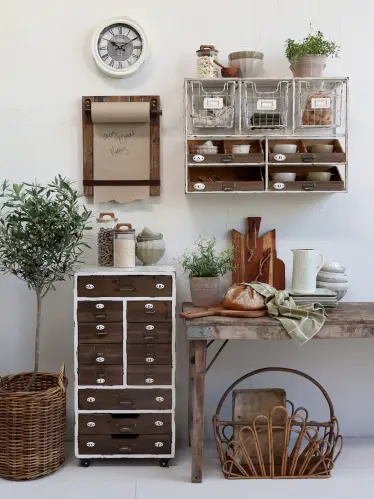Byrå på hjul med 12 lådor. Lådorna är märkta med bokstäver på keramikplattor - för att du på ett enkelt sätt ska kunna sorta innehållet i byrån.