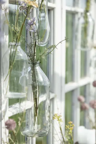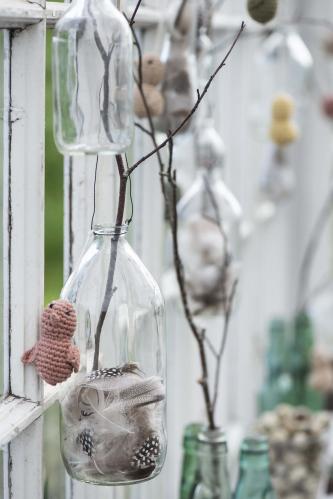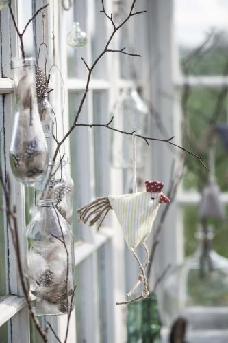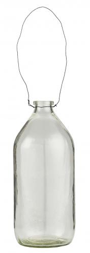 Söt liten glasflaska med en ståltråd till upphängning. Använd som en liten vas för blommor eller som ljusstake. Så mysigt att dekorera med dessa i tex en ljuskrona och variera blommorna och kvistarna du stoppar i efter säsong.