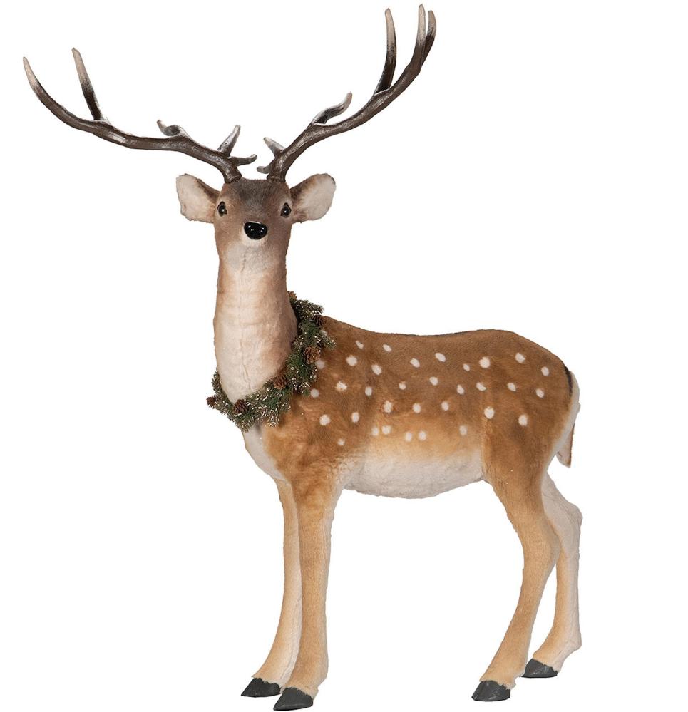 En riktigt stor hjort med en krans runt halsen. Superfin! Tänk denna bredvid julgranen eller som första möte i hallen. Det finns en hel familj till denna för den som vill ha. Den är fin ensam men också så fin att ställa i en liten familj med flera hjortar. Tillverkad i frigolit och textil. Ett helt underbart julpynt men också fin året runt i exempelvis en fjällstuga.