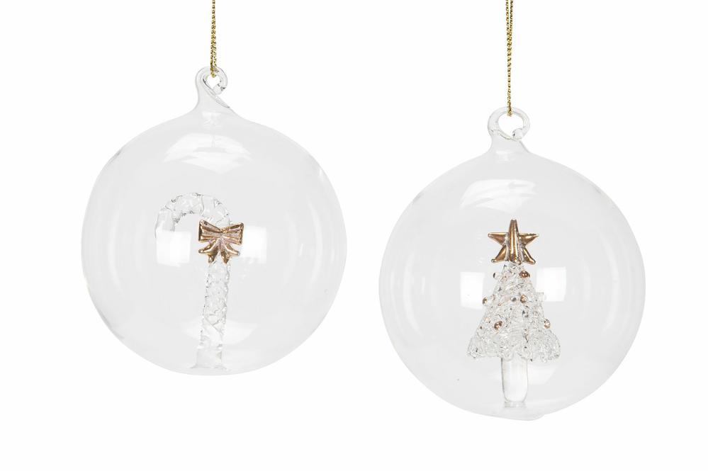 Genomskinliga julgranskulor med polkagrisstång eller julgran inuti. Perfekta för att klä julgranen. Du får en julkula när du beställer denna produkt men köper du fler blandar vi de olika varianterna till dig. Önskar du en speciell så kan du lämna en kommentar i kassan så löser vi det.