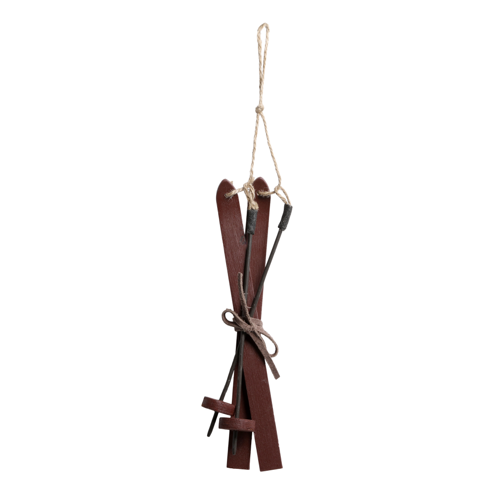 En handgjord julkula som föreställer en brun/röda skidor med stavar. En söt och rolig detalj att hänga i julgranen.