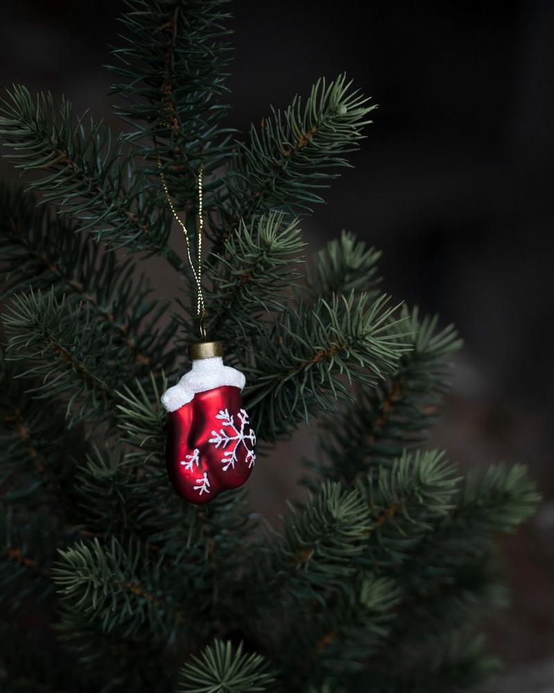 Julgranen får en lekfull touch med denna hängande dekoration som ser ut som vantar.