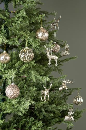 En vacker älg att hänga i julgranen. Färgen heter champange och är guldsilvrig. Passar därför fint oavsett om man vill ha en jul i guld eller silver. Tänk så fint det skulle vara att överraska älgjägaren med en julgran full med älgar.
