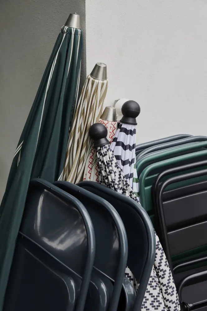 Skapa en informell, cafèliknande myshörna i trädgården eller på balkongen med detta Helo-setet från House Doctor. Två stolar och ett bord ger dig en perfekt plats för avslappning. Järnet har fått ett mörkgrönt pulveröverdrag för att göra det nutida och lämpligt att passa i alla hem. För att spara plats i små utrymmen kan du helt enkelt slå upp bordsskivan och vika ihop stolarna när de inte används. Fullborda bordsdukningen med kuddar och dekorera bordet med ljusstakar för att få en inbjudande och härlig känsla. För att förlänga livslängden ska du inte lämna Helo utomhus i regn eller kyla, utan flytta in den så att den förvaras säkert.