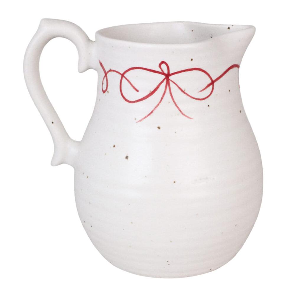 Elegant gammaldags kanna med hantag i stengodslera och prickar, vackert handmålad bård upptill med en dekorativ rosett. Prickarna på stengodset blir olika tydliga, beroende på temperaturen som godset bränts i, likaså nyansen på leran. Kannan är passande till all sorts dryck eller använd som vas.