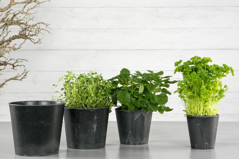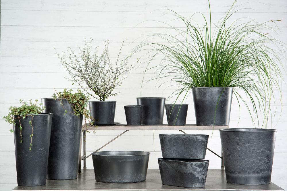 Stilren och snygg gråmelerad kruka som ser ut som betong men är i plast. Superbra där man vill ha en blomkruka som absolut inte läcker vatten.