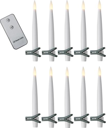 Trådlös julgransbelysning med 10 vita granljus för inomhusbruk. Ljusen ser verklighetstrogna ut och ger ett fint varmvitt sken. Det medföljer gröna hållare och fjärrkontroll.