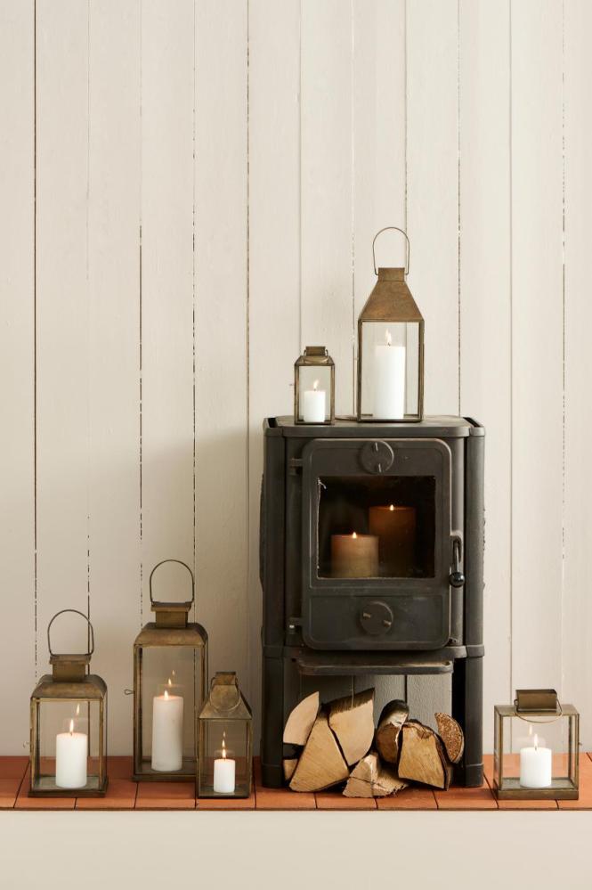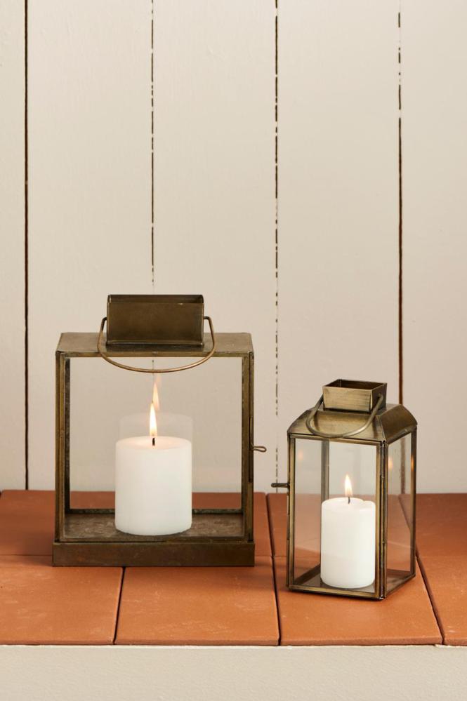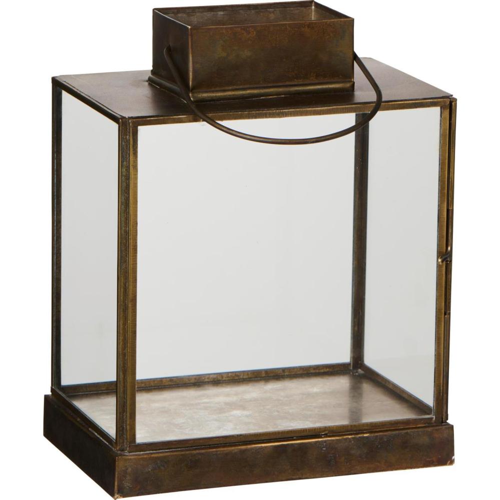 Avlång lykta - Tillverkad av mörk metall i en antik mässingsfärg med paneler av klart glas. Dess rektangulära form och släta metallfinish ger lyktan ett minimalistiskt och tidlöst utseende.