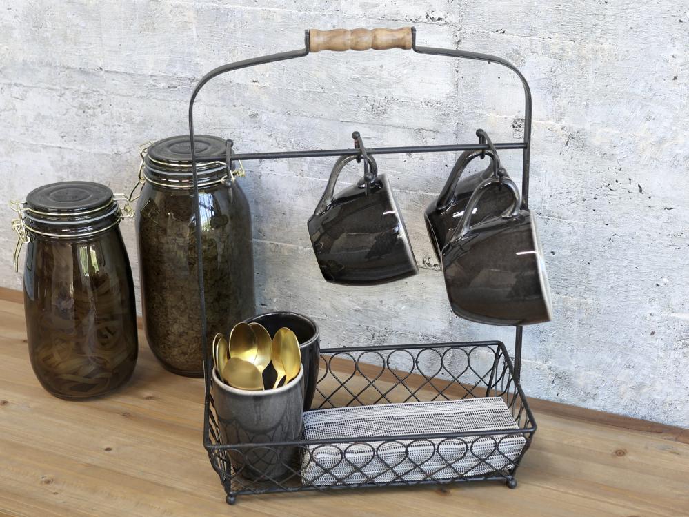 Härlig mugghållare med korg, ett snyggt och praktiskt sätt att förvara muggarna på!