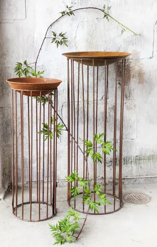Superfin ställning i rostig metall med ett dupt fat, passar perfekt till växter och andra dekorationer i trädgården. Utmärkt att ha utomhus på altanen eller uteplatsen.