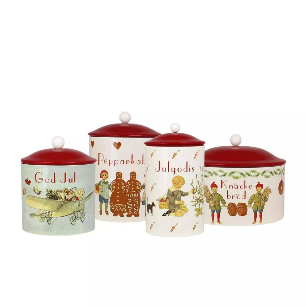 Gammaldags plåtburk för julgodis, småkakor, pepparkakor och annat smått och gott som hör julen till. Nostalgiskt julmotiv i form av en jultomte i ett flygplan, full med massa julklappar. Ett rött lock med knopp och en silikonring runt burken så locket sluter tätt. Så fin att ha i det nostalgiskt klassiska julhemmet. Perfekt att ställa fram på julafton och under hela december. Dessa burkar är handgjorda vilket gör att ojämnheter och olikheter förekommer och de tål inte maskindisk.