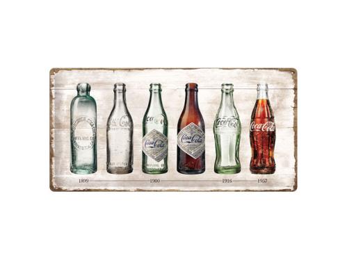 Superfin skylt med vintagekänsla. Motivet föreställer Coca Colas flaskor från 1899 till 1957. Supercool tavla i metall till tonårsrummet, uterummet, vardagrummet eller bakom en bar.