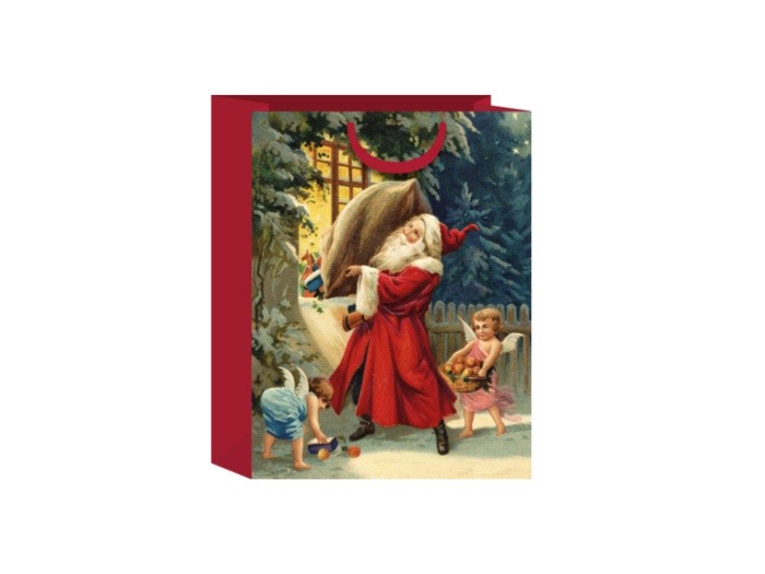 Superfin presentpåse till åretsjulklappar med ett motiv av tomten med sin stora presentsäck samt änglar som hjälper honom.