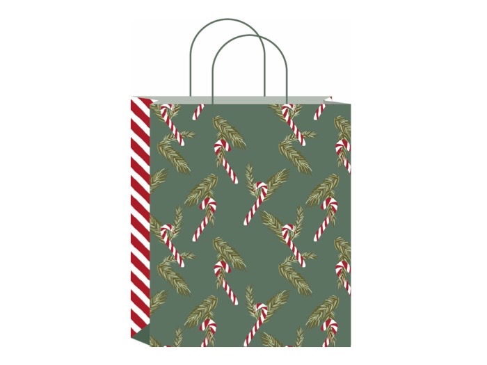 Superfin presentpåse till åretsjulklappar med ett motiv med granbarr och polkagrisar.