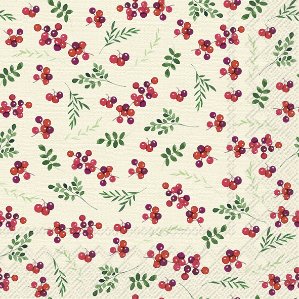 Servetter full av små röda bär och blad. Söt att duka med både till middag och fika.
