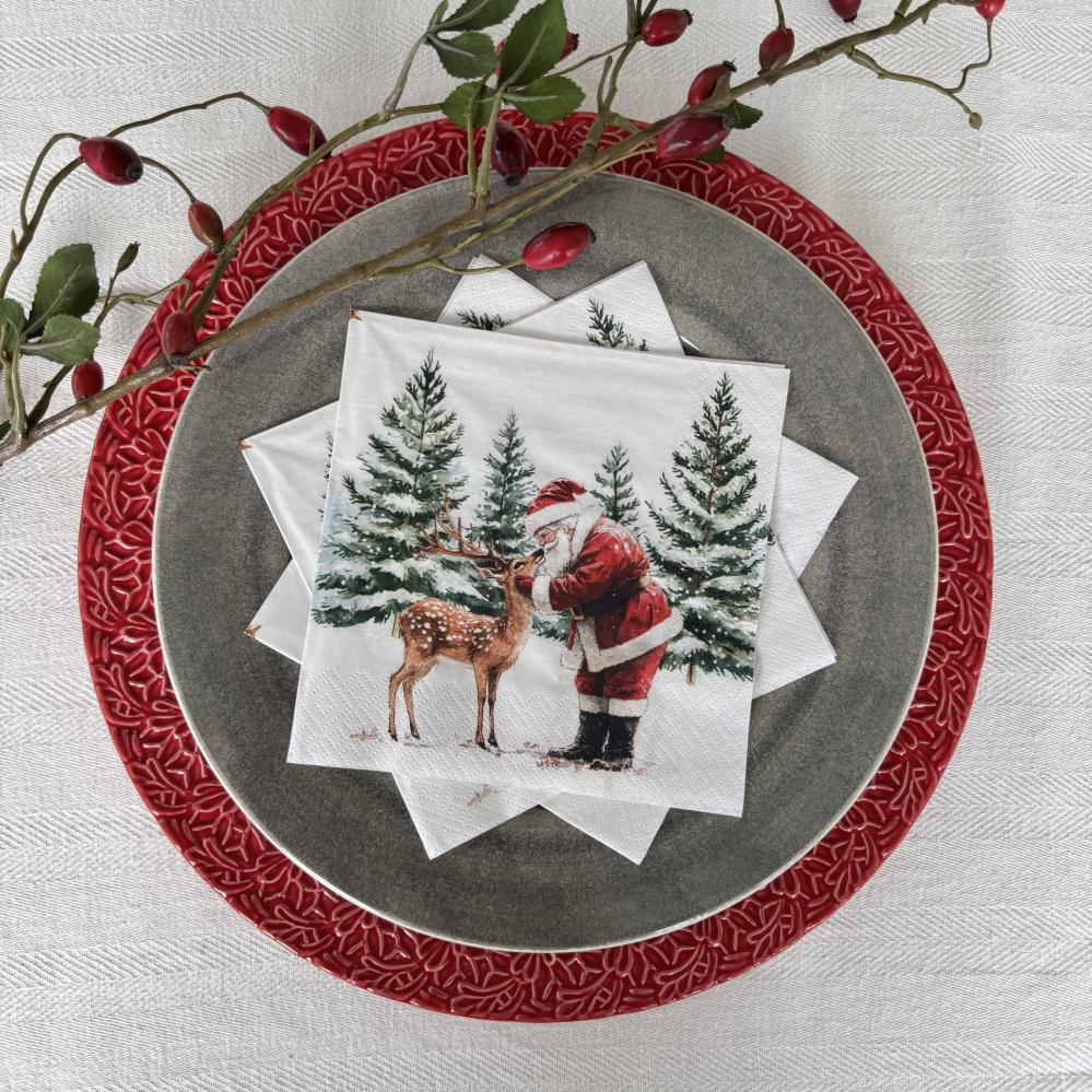 En servett med ett vintrigt motiv av en tomten och ett rådjur i skogen.