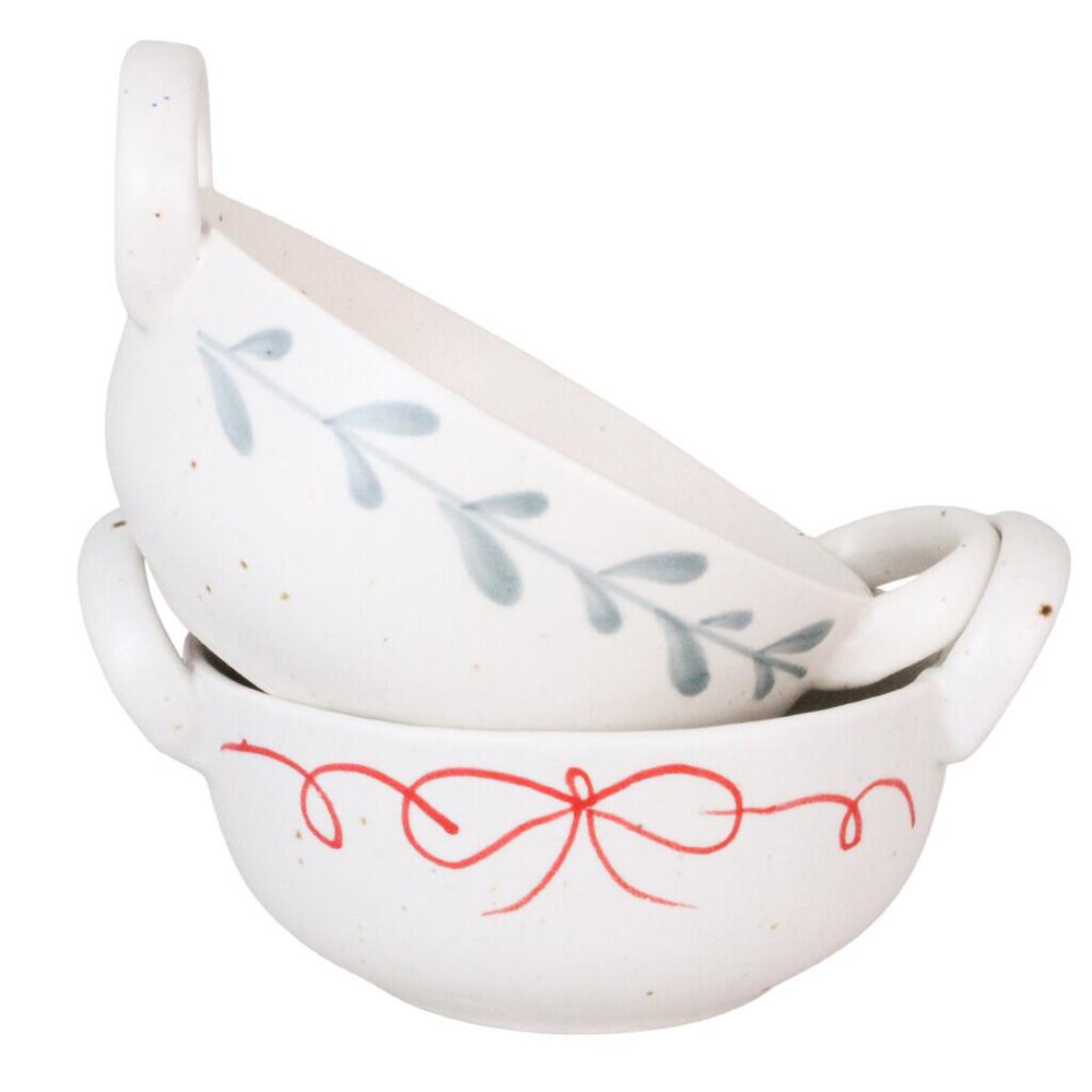 Serveringsskål med handtag i stengodslera och prickar, vackert handmålad bård med dekorativ rosett. Prickarna på stengodset blir olika tydliga, beroende på temperaturen som godset bränts i, likaså nyansen på leran. Denna skålen passar perfekt till köttbullarna, brysselkålen eller julgröten. Kombinera gärna med fler delar i serien Viola för en fin helhet.