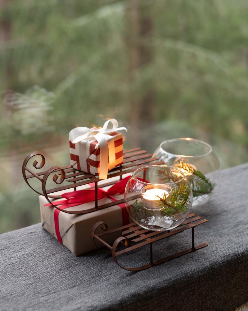 Denna dekorativa släde passar utmärkt som prydnad på hyllan, i fönstret och som en del av en vinterdekorationen. Kombinera gärna med granris, kottar, ljus eller andra säsongsdetaljer för en extra varm och inbjudande känsla.