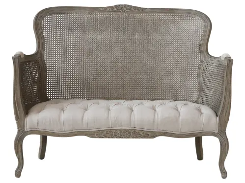 Vacker liten 2-sitssoffa med flätad rygg och beige linnetyg med knappar och svängda ben. Bedårande modell av mindre soffa som passar den franska lantstilen men också till många andra inredningsstilar. Passar i vardagsrummet, sovrummet, hallen eller varför inte i tonårsrummet?