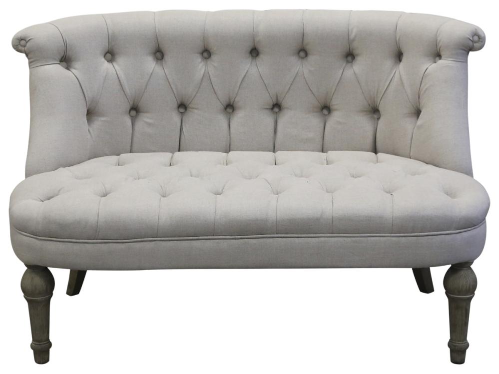 Vacker liten 2-sitssoffa i beige linnetyg med knappar och svarvade träben. Vacker och klassiskt modell av soffa som passar den franska lantstilen men också till många andra inredningsstilar. Passar i vardagsrummet, sovrummet hallen eller varför inte i tonårsrummet?