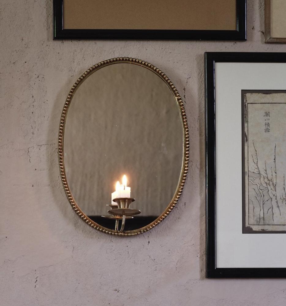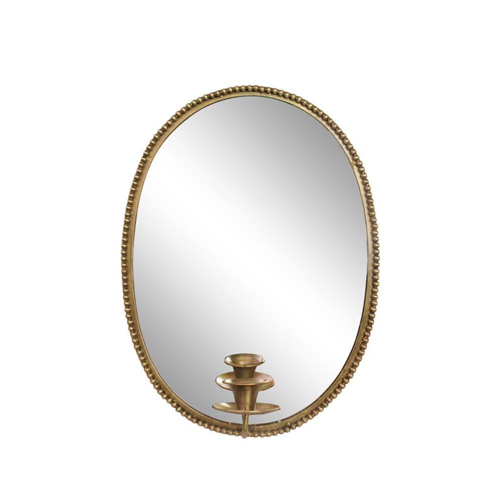 Oval spegel i antik mässingsfinish med en dekorativ kant prydd av små runda prickar. Med en ljushållare i mässing, avsedd för kronljus. Spegeln reflekterar ljusets låga och skapar ett stilfullt ljusspel.