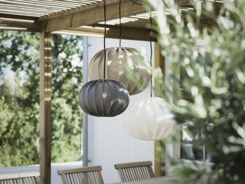 Hilma skärm för utomhusbruk. Skapa en härlig och mysig utemiljö med våra Outdoor takskärmar. Passar lika bra i uterummet som på terrassen under tak. Denna fina takskärm är gjord i ett vädertåligt tyg och har en stomme i galvaniserat stål, som klarar att hänga ute oavsett väder. Komplettera med takupphänge E27. IP44.