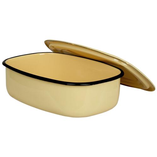 Ugnsform med lock i gul emalj. Locket har en målad kant i svart. Funkar bra i alla ugnar men tål ej mikrovågsugn. Jättefint att kombinera med våra andra produkter i emalj för att skapa den där härliga, gammaldagsa känslan i köket! Våra ugnsformar i emalj håller hög kvalitet och vi rekommenderar handdisk för lång hållbarhet.