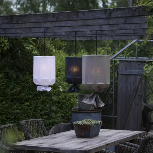 Vacker och stilren lampa för utomhusbruk.Tygskärm som är ihopknuten nedtill. Denna trendiga lampskärm skapar ett härlig miljö i uterummet, på altanen eller varför inte i ett träd? Tyget är vädertåligt och stommen är i galvaniserat stål så den klarar att hänga utomhus i alla väder. Svart takupphänge ingår med 5 meter sladd och jordad el för utomhusbruk med IP-klass 44.