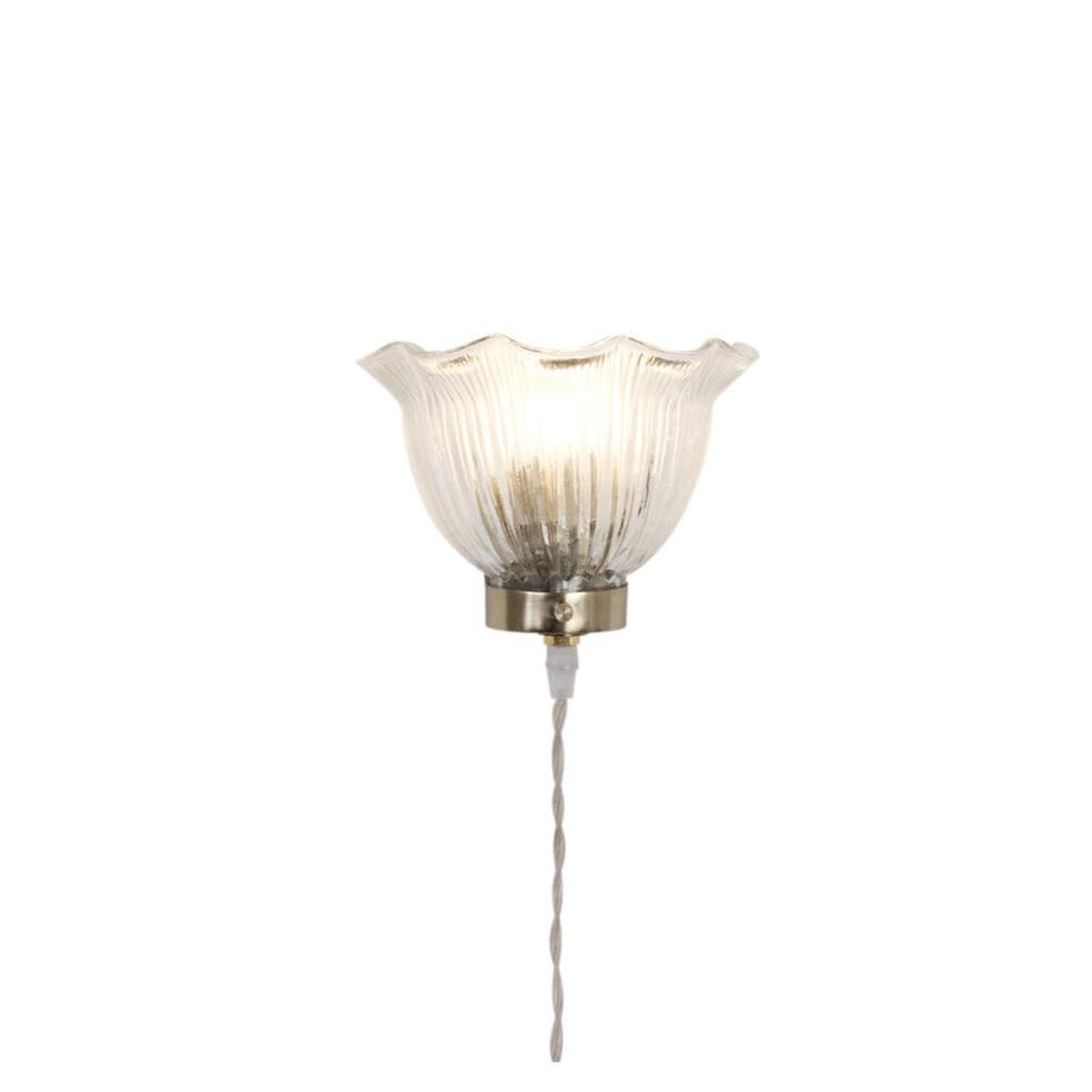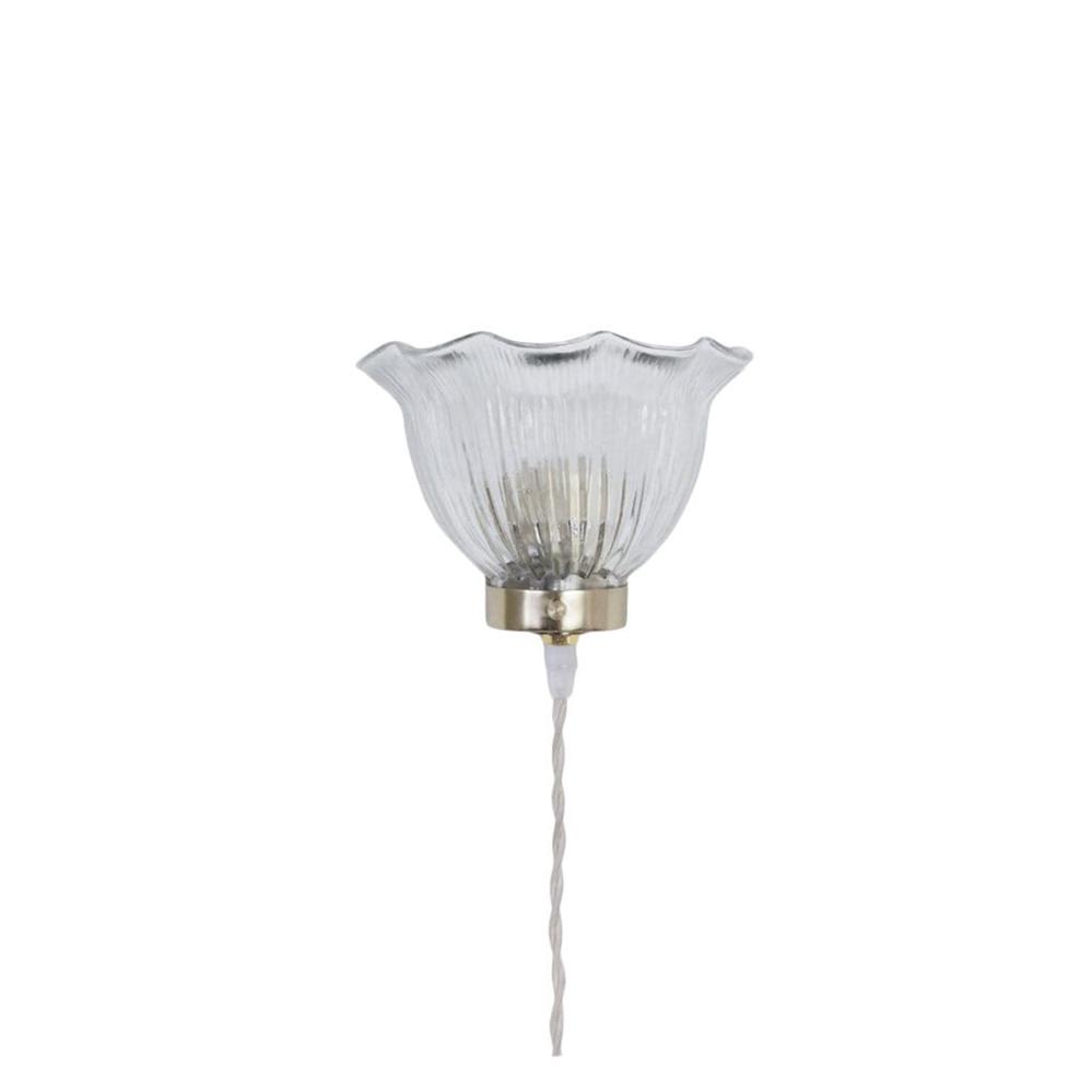 En vacker och tidlös vägglampa i mässingsfinsih och vågigt glas.