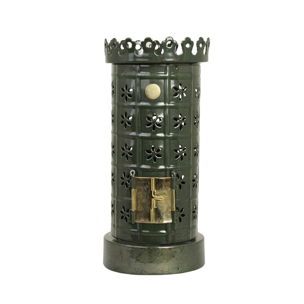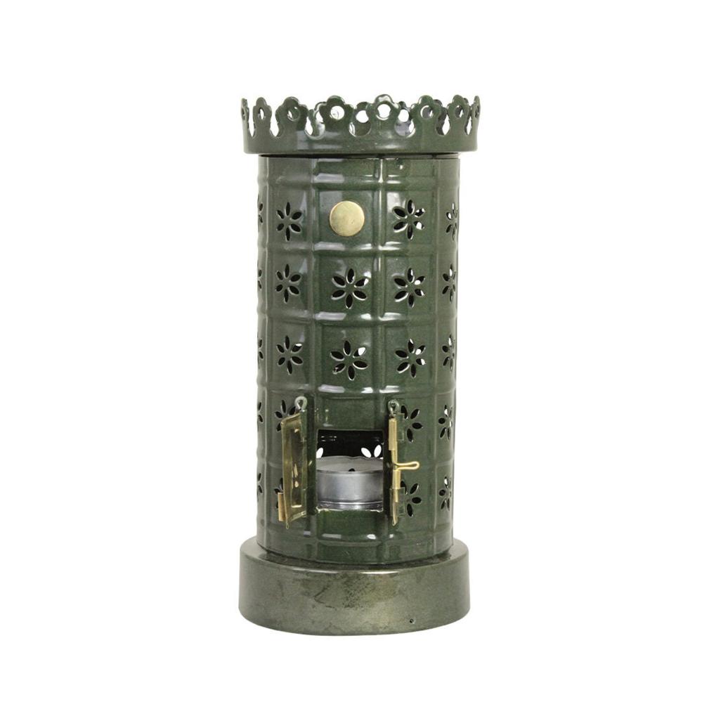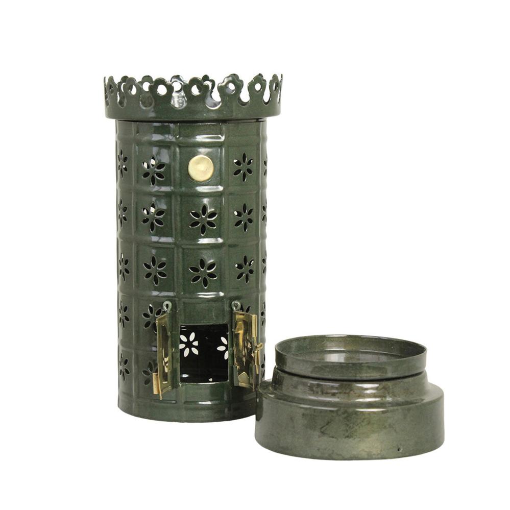 Vacker värmeljushållare i keramik med design inspirerad av en klassisk kakelugn i miniformat. Den mörkgröna ytan och de perforerade partierna gör att ljuset från värmeljuset lyser ut på ett dekorativt sätt.