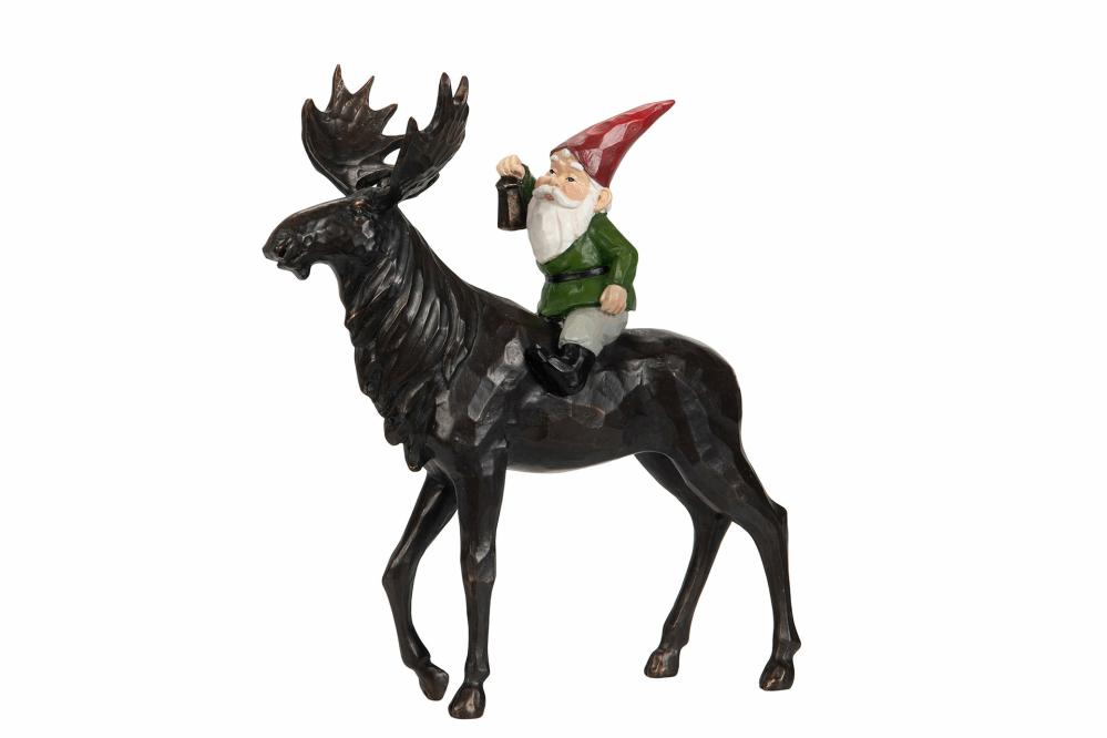 Vätte som rider på en älg. En lekfull dekoration som är perfekt till jul eller året runt.