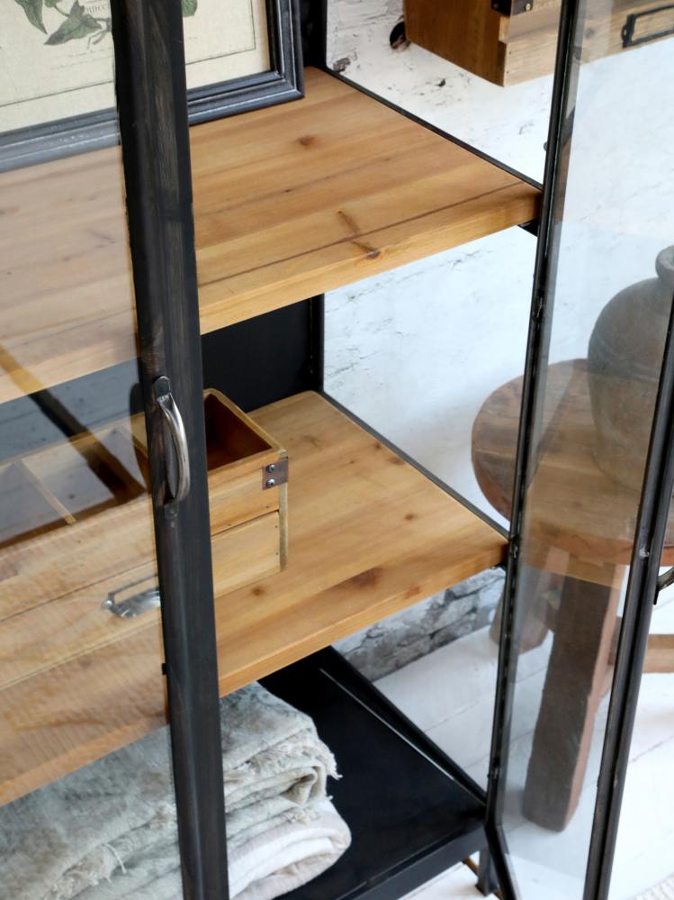 Vackert vitrinskåp i antik svart med glasdörrar och hyllplan i trä.