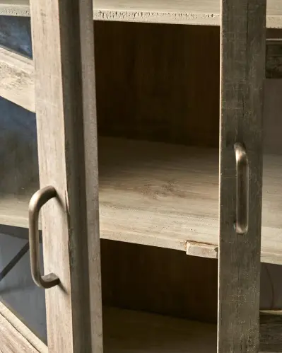 Rustikt och vackert vitrinskåp. Tillverkad av återvunnet trä. Färgnyans och träslag varierar en aning.